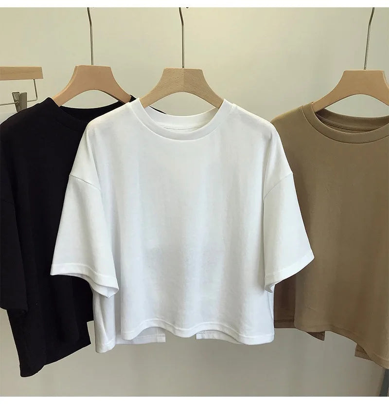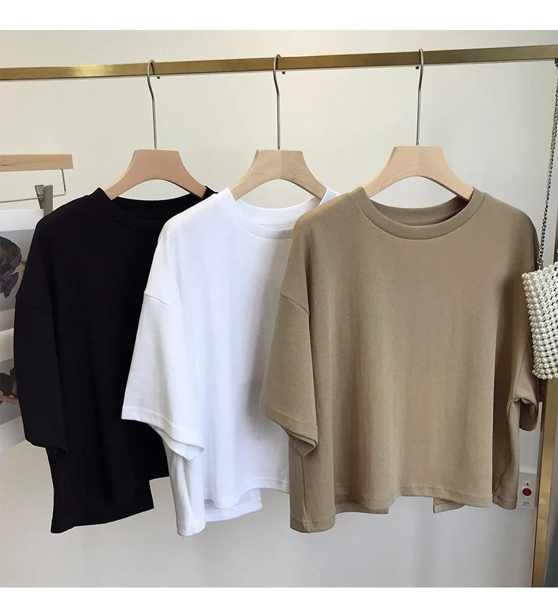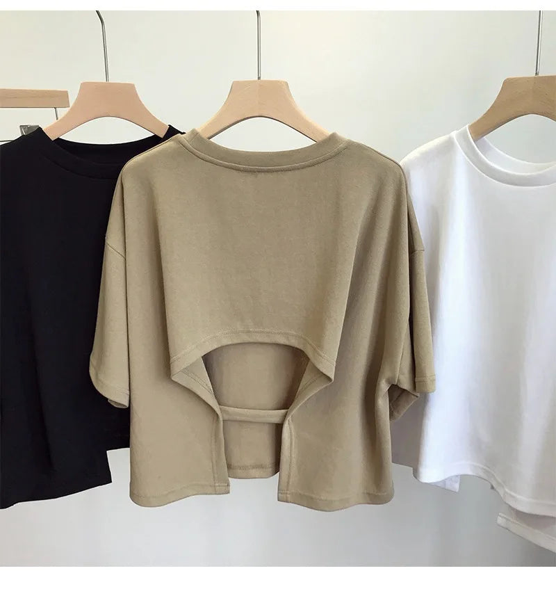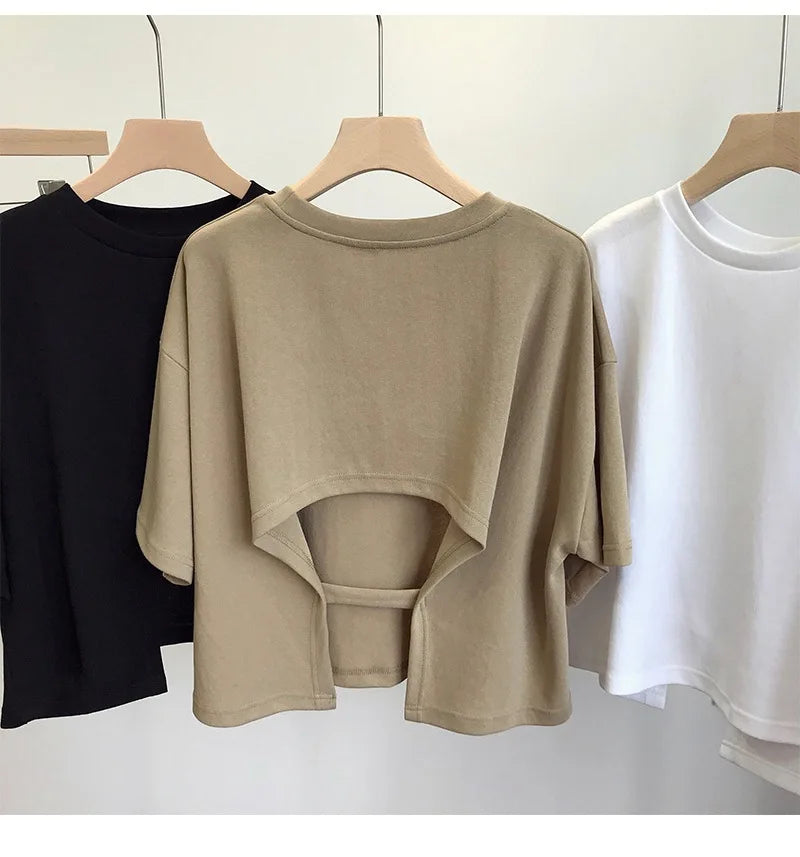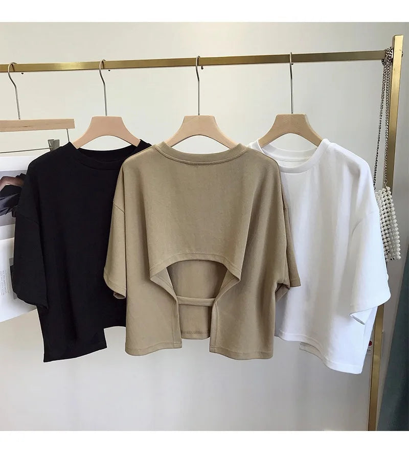 Summer New Ladies Casual Backless T-Shirt 2023 Korean Women Round Neck Loose Sweet Spicy Wind Short-Sleeved Crop Tops